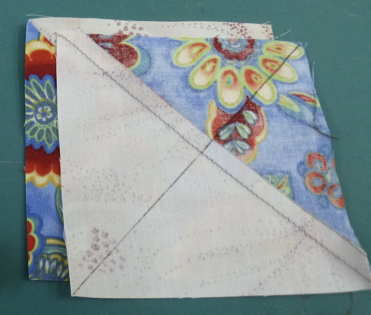 Draw a diagonal line on the wrong side of each of the light squares. Pair these up with the dark fabrics, right sides together and sew a 1/4 inch seam on either side of the drawn line.Cut apart on the drawn line and press towards the dark fabrics. You will have two pairs of triangle squares.