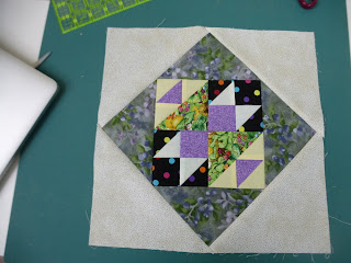 Light Fabric 1: cut 3 squares @ 2 3/8 x 2 3/8 inches. Cut 2 of these in half along a diagonal