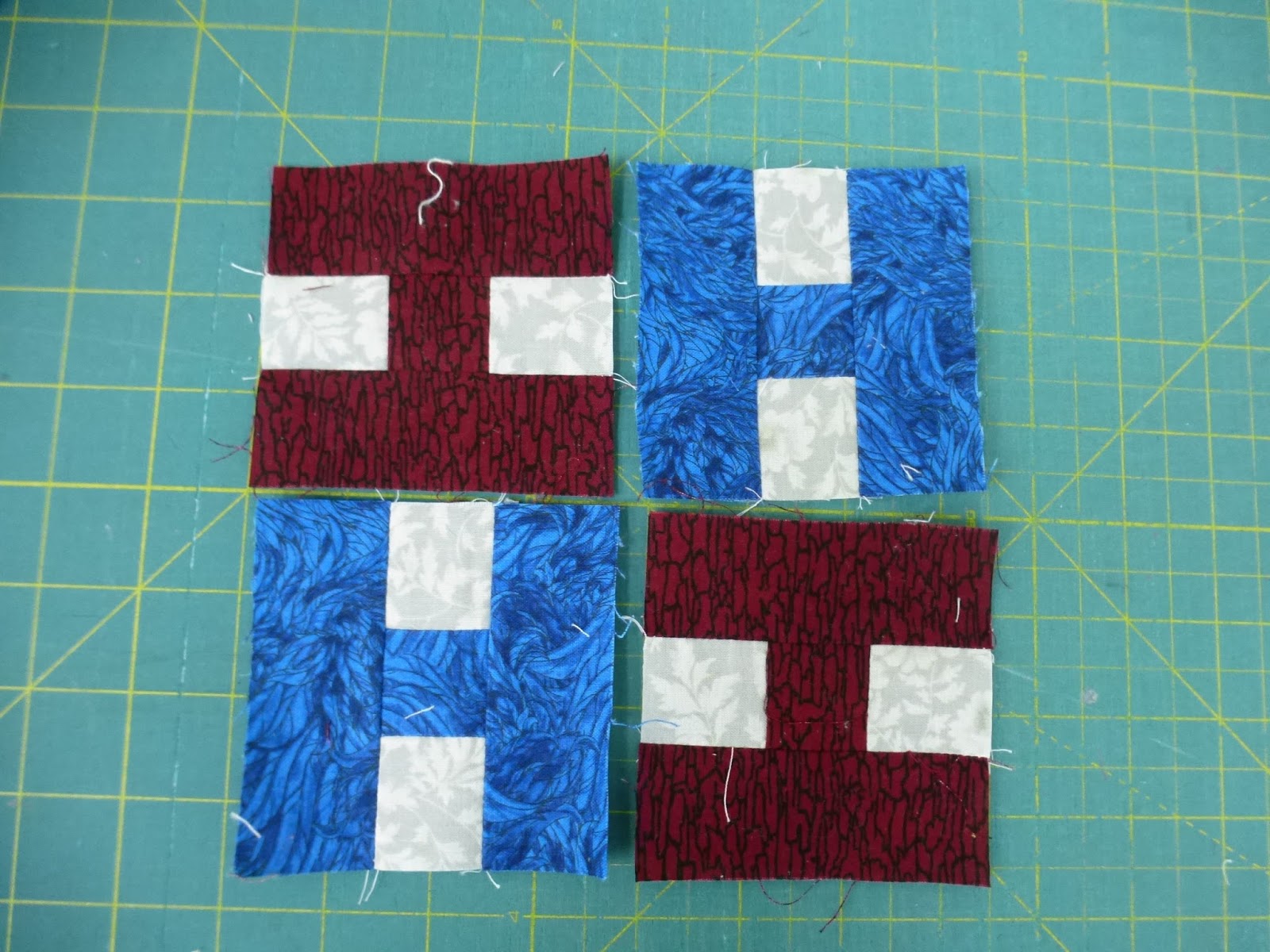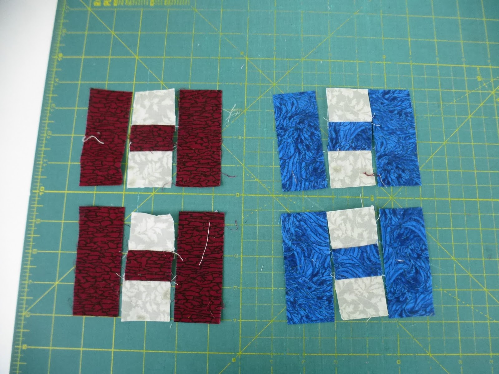 Then, arrange the dark 1 1/2 inch x 3 1/2 inch rectangles as shown below, and sew together.