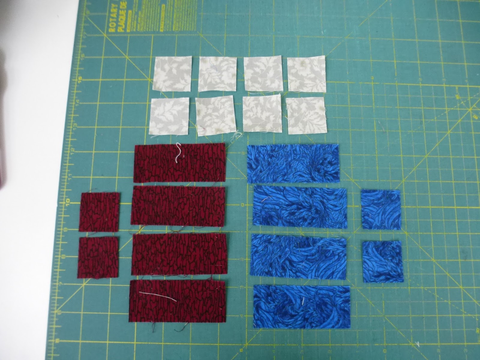 Then, arrange the  dark 1 1/2 inch x 3 1/2 inch rectangles as shown below, and sew together.