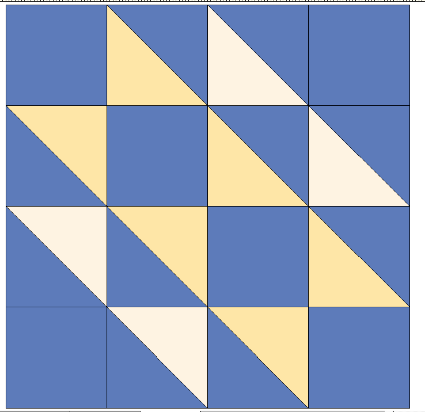 Arrange your triangle squares along with the 2 inch dark squares as shown below. Pay close attention to the arrangement and position of your triangle squares. The picture here is from the Electric Quilt program.