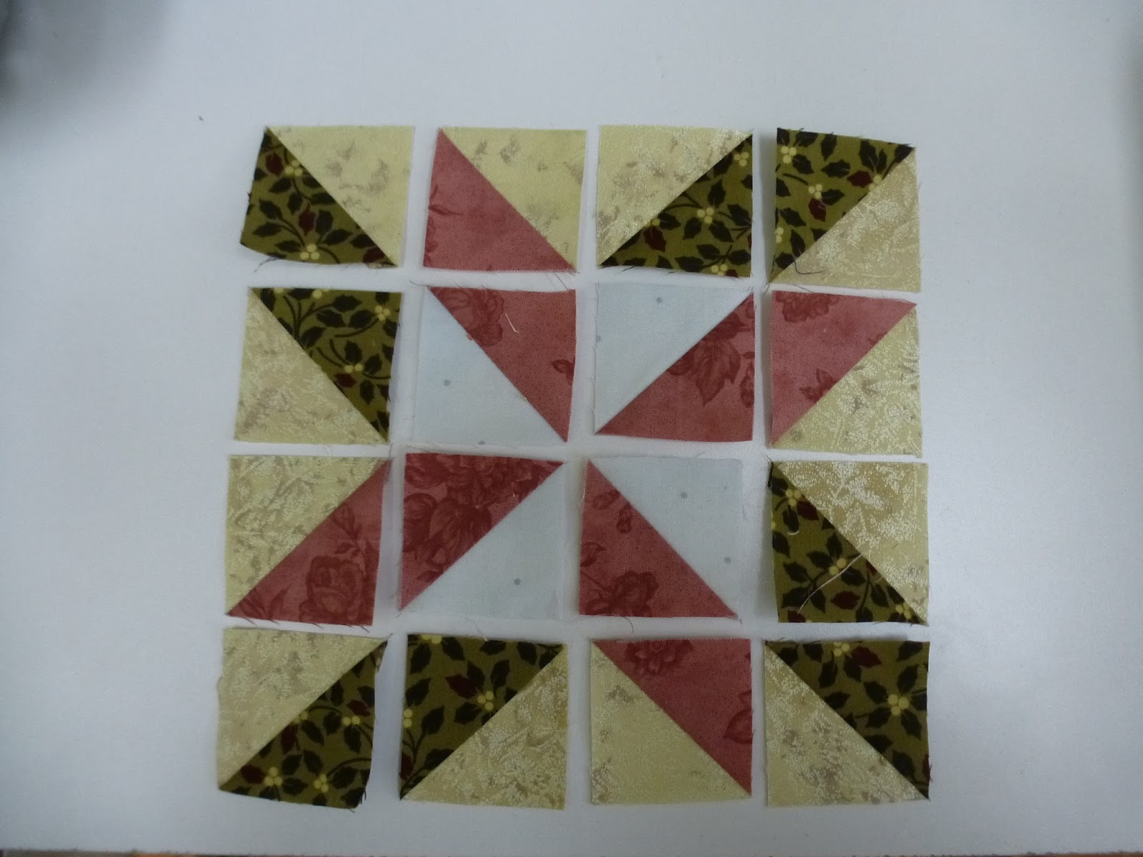 Draw a diagonal line on the wrong side of all the light squares. Pair up the 2 lightest fabric squares with two of the medium fabrics. Pair up the rest of the light fabric squares with the remaining medium and dark fabrics.Place your pairs right sides together and sew a 1/4 inch on either side of the drawn lines on the light fabrics. Cut these apart on the drawn lines and press towards the dark fabrics. Arrange your triangle squares as shown in the photo below and sew together. Pay close attention as you arrange and sew them together. It’s easy to get one turned the wrong way.