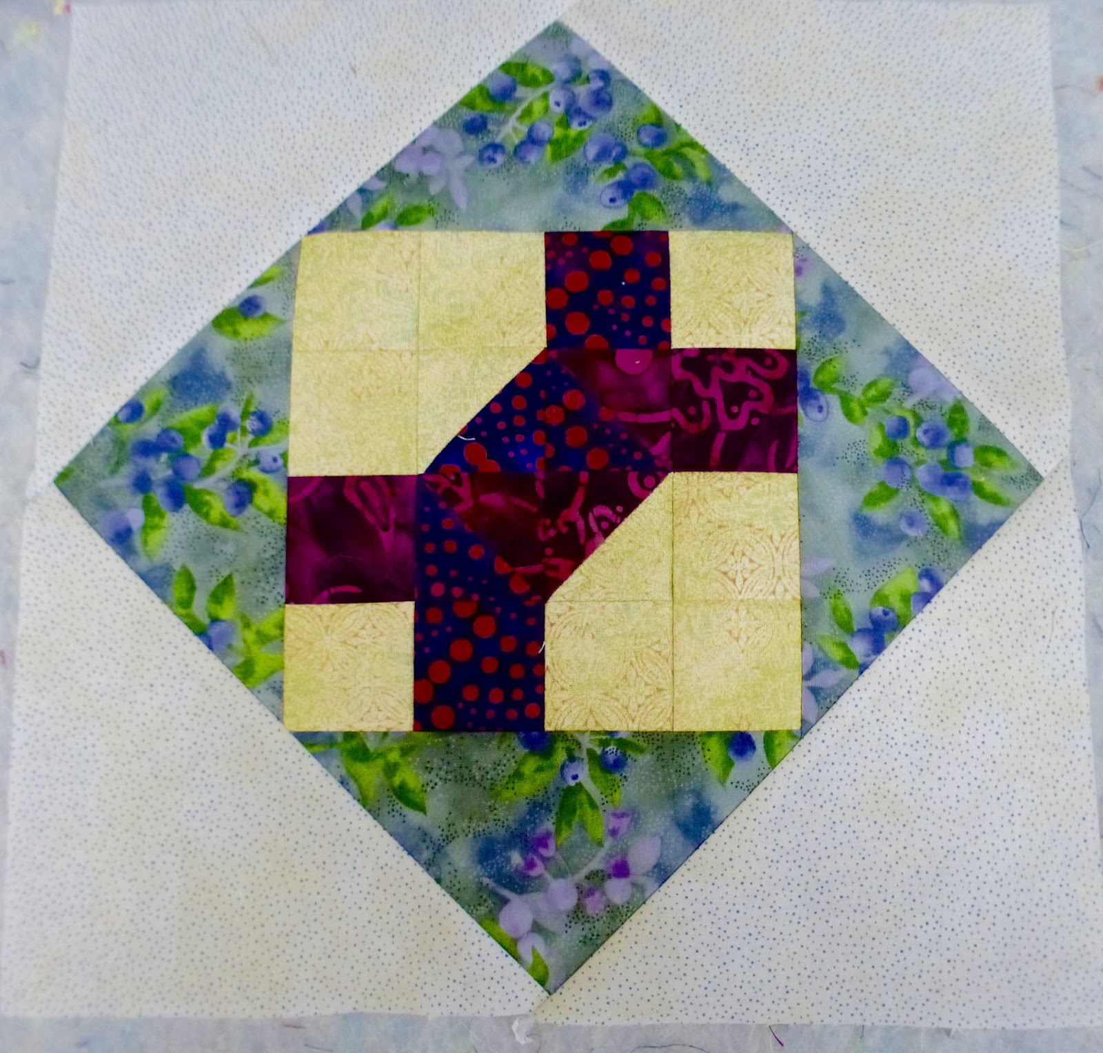 The photo of my block was not distinct enough to show the placement of the fabrics, so I’ve used an Electic Quilt 7 drawing instead. Arrange your fabrics as shown in the picture, and sew together.