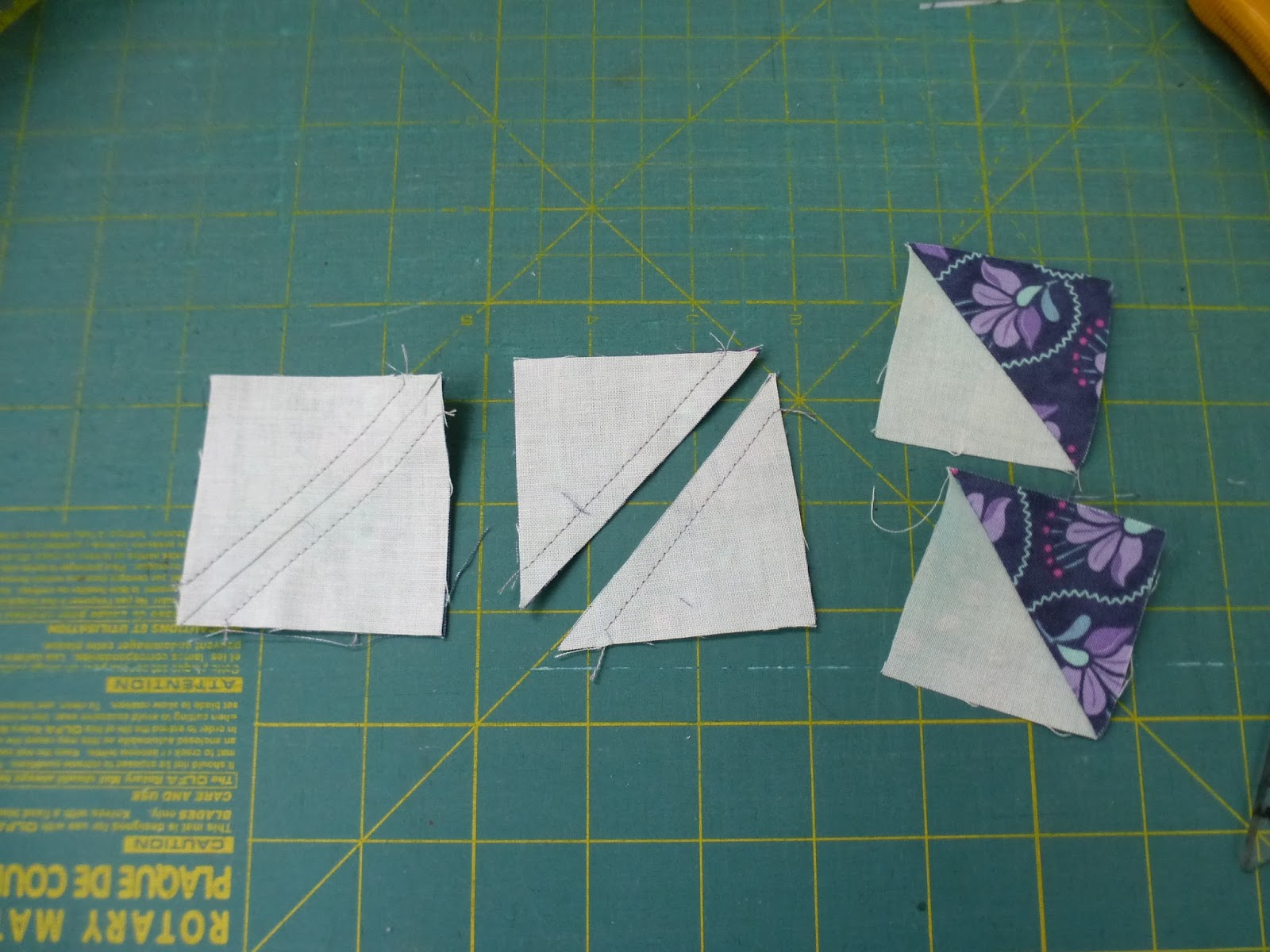 Draw a diagonal line on the wrong side of all the light squares. Pair the light squares with the dark squares, right sides together and sew a 1/4 inch seam on either side of the drawn line. Cut apart on the drawn line and press to the dark.