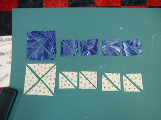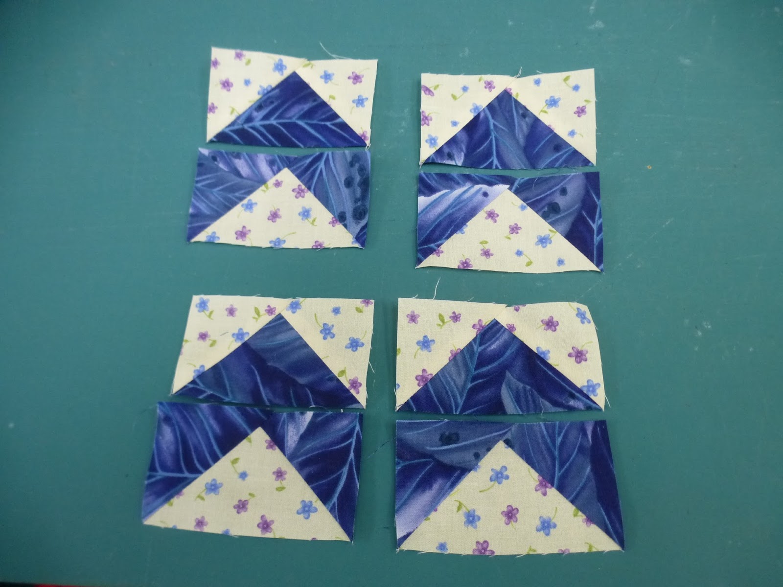 Dark fabric: Cut 1 @ 4 1/4 x 4 1/4 inches square. Cut this square twice on the diagonals.