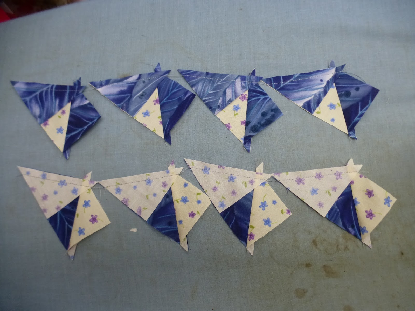 Using the photos below as a guide, pair up a light 2 3/8 inch triangle with each of the dark 4 1/4 inch triangles, right sides together. Sew a 1/4 inch seam on the long seams. Do the same with the dark 2 3/8 inch triangles and the light 4 1/4 inch triangles. You’ll end up with 8 units looking like this.