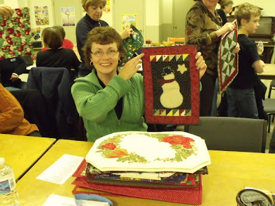 The London Friendship Quilt Guild help a wonderful December meeting last night. It was a nice, relaxed evening with plenty of time to socialize and some fun games and wonderful show and tell. Laurel, from London Meals on Wheels attended to accept our donation of lots of placemats for their clients. Here she is sharing how the placemats brought so much joy to their clients last year!