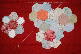 There are 2 methods that people use when making this quilt. English Paper piecing and the American method. Paper piecing requires the fabric to folded and basted to a paper hexagon templates and each piece is whip stitched together. When the templates are removed the seams stay open and flat.