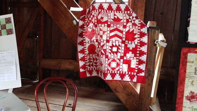 Members of London Friendship, Jacqui V, Bonnie H, Anne L, Lyndsey J, Lorriane S, and Lorna M set up a display of our Canada 150 Challenge pieces for two days at Fanshawe Pioneer Village. It was Agricultural Fair Weekend in the village, and talking with visitors about our work provided an opportunity to promote the art of quilting and raise awareness of our own guild. Adding to the display were hand quilting projects and Jacqui’s hand crank sewing machine, as well as some extra quilts. Visitors were interested in the 150 challenge pieces and the stories behind them. Thank you to all participants for allowing us to display your work. Pictured are Jacqui V. and Bonnie H. Also two of our members, Carol B. and Lyndsey J, entered items in the fair at the village and both won prizes for their work!