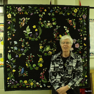 Many of her early works were done in the Baltimore Album style. Beautiful applique of ribbon flowers, “critters”, and many birds that have landed on her bird feeders. She has entered her quilts for judging in many contests and has won awards, but enters less frequently and only if she is passionate about the contest.