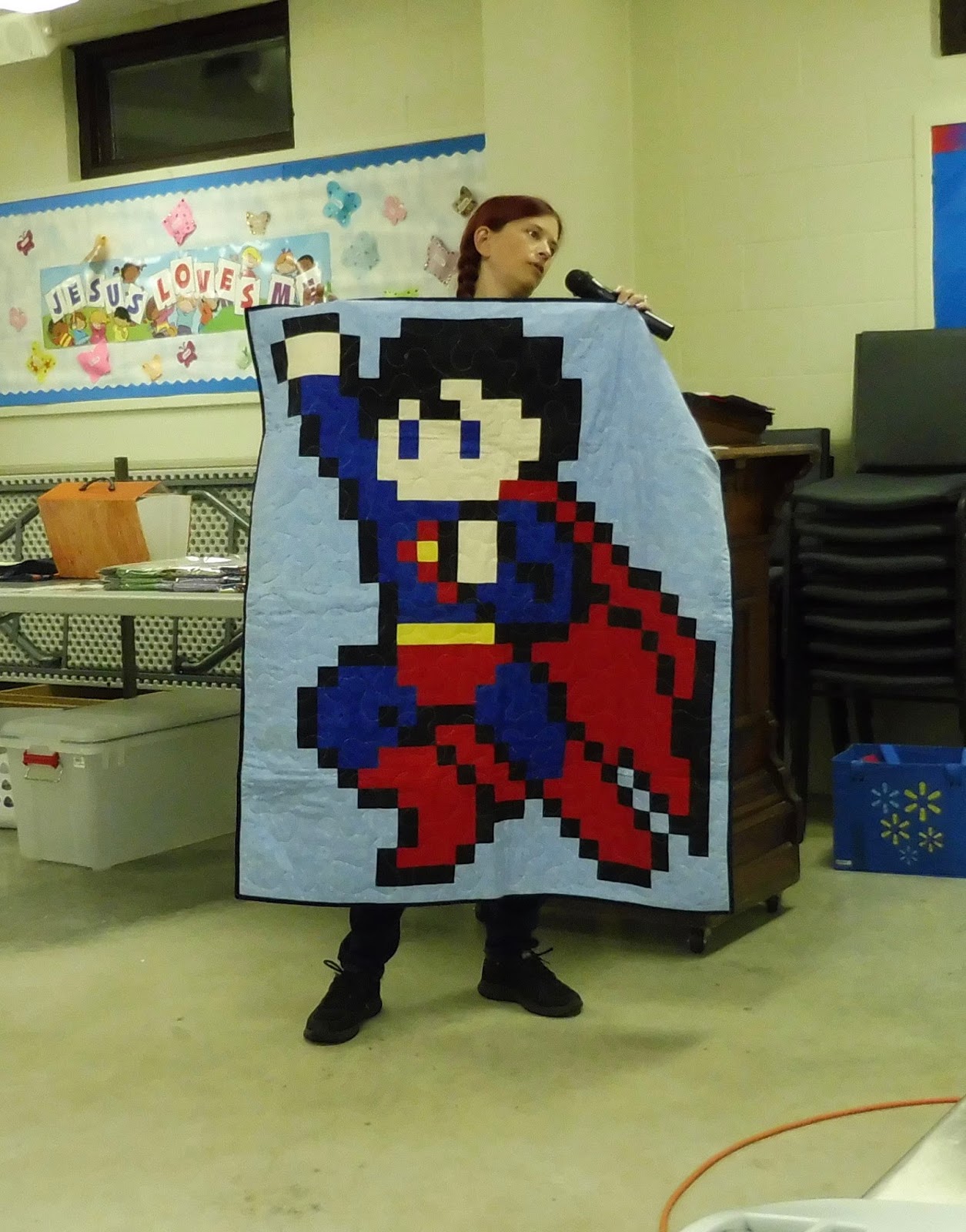 We had our first meeting of the new year on September 14th. It was great to be able to see and reconnect with everyone. After the opening business with the executive of the guild was finished, we were treated to a trunk show by one of our members, Toni Smith. She specializes in making “pixelated” quilts from comic book and video game characters. She sells her quilts and patterns and also travels to various conventions both quilting and comic book related. What a very cool way to make a living from quilting! Here website is here, Quiltoni