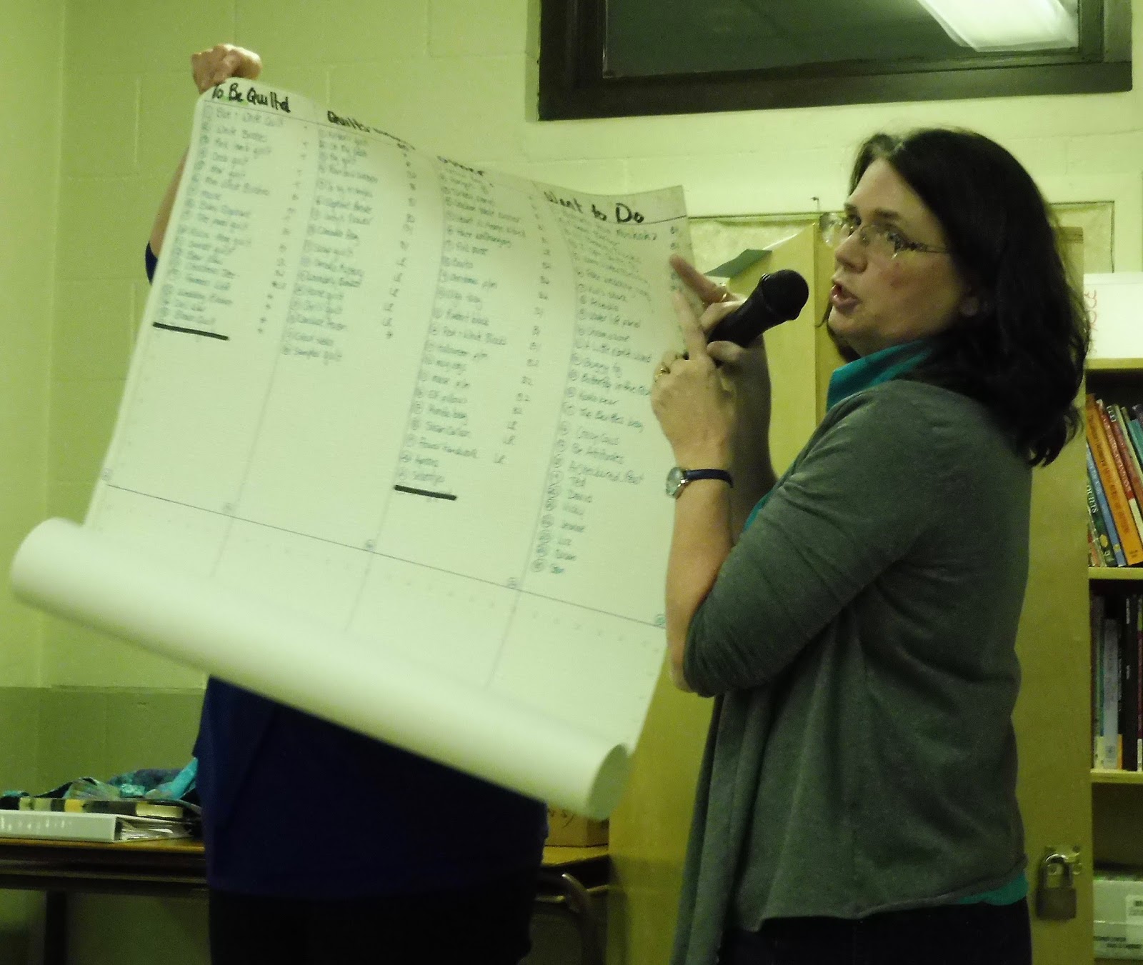 Anne didn’t show a quilt, but instead showed us her chart that lists all her UFOs, WIPs, and other lists she’s made up to keep herself organized.