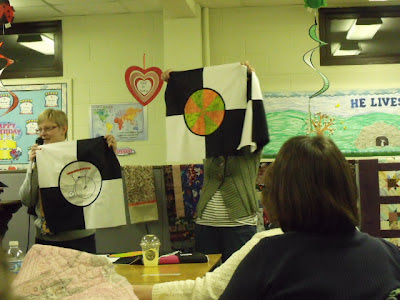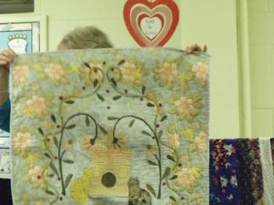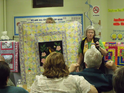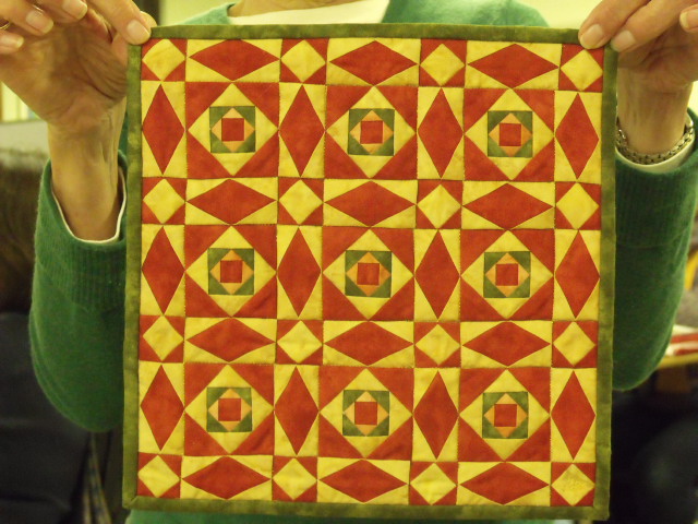 The London Friendship Quilt Guild had the privilege of hosting Kathy Wagner at our guild meeting on Thursday evening. Kathy presented a trunk show of her delightful quilts – larger and teeny tiny! She began by asking everyone if they considered themselves creative and artistic. By the time she finished her trunk show, and asked the question again, many of us were a little less timid in raising our hands :-). Here is Kathy showing a couple of her small blocks: