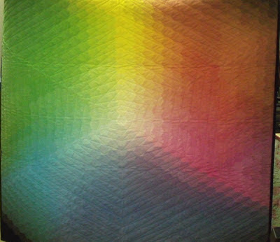 This quilt is called “Trinity”. Each hexagon was produced by printing its unique colour formula onto white cotton with an inkjet printer!
