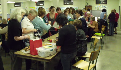 The registration table is a busy place before the meeting and at breaks! We need to get those tickets, bring our postcards, notion of the month (apples this time for the food bank) and sign up for classes!