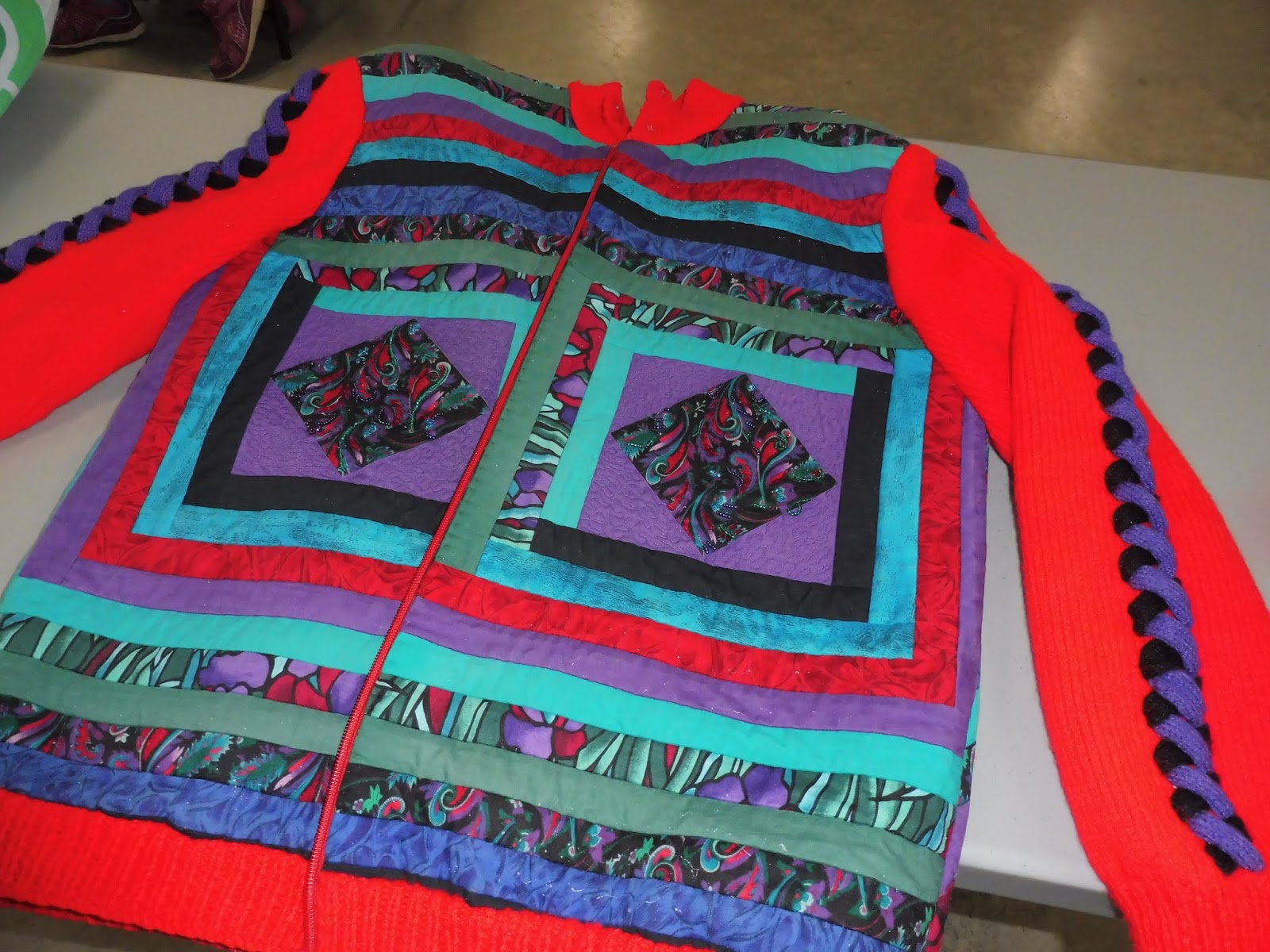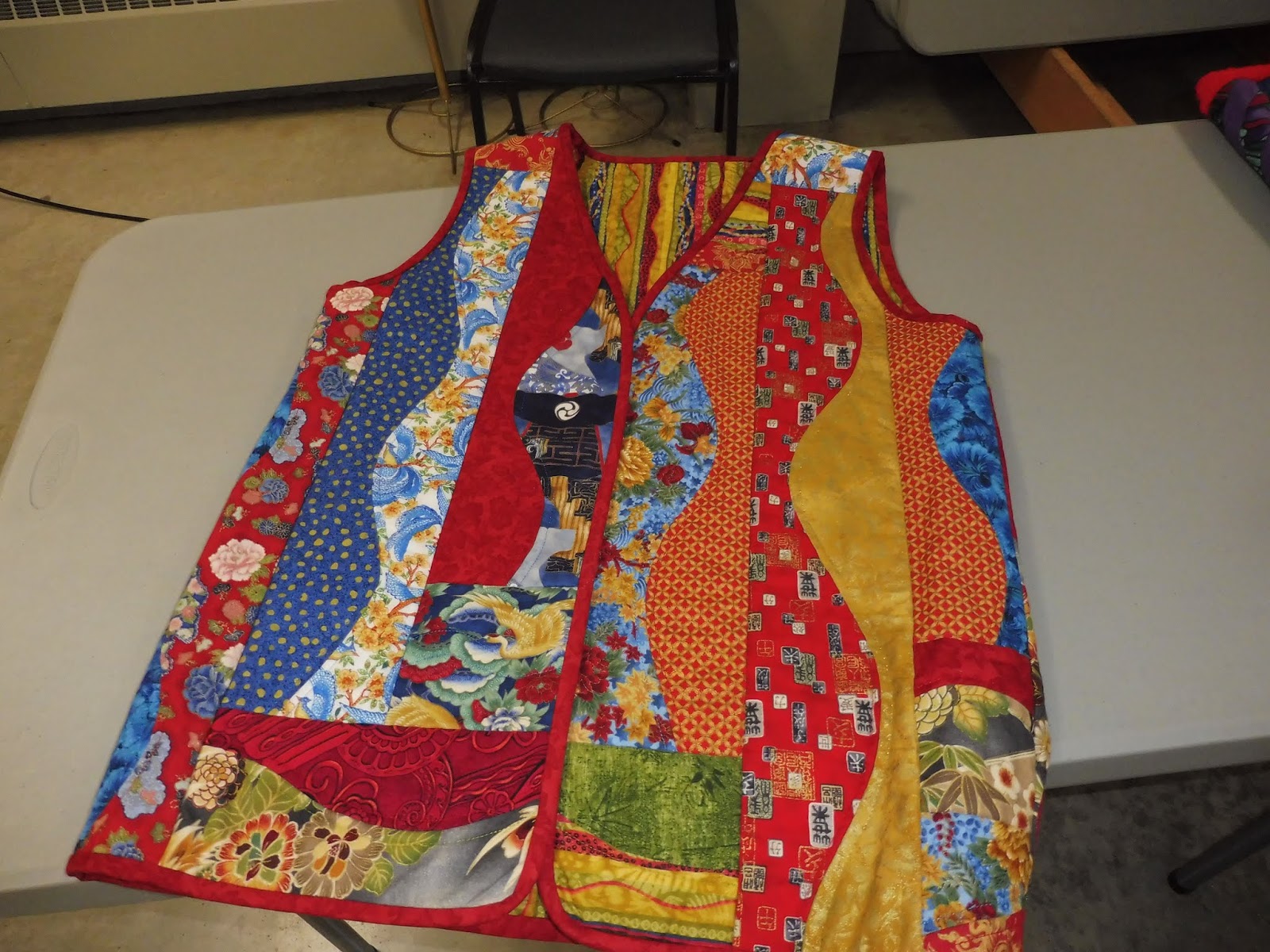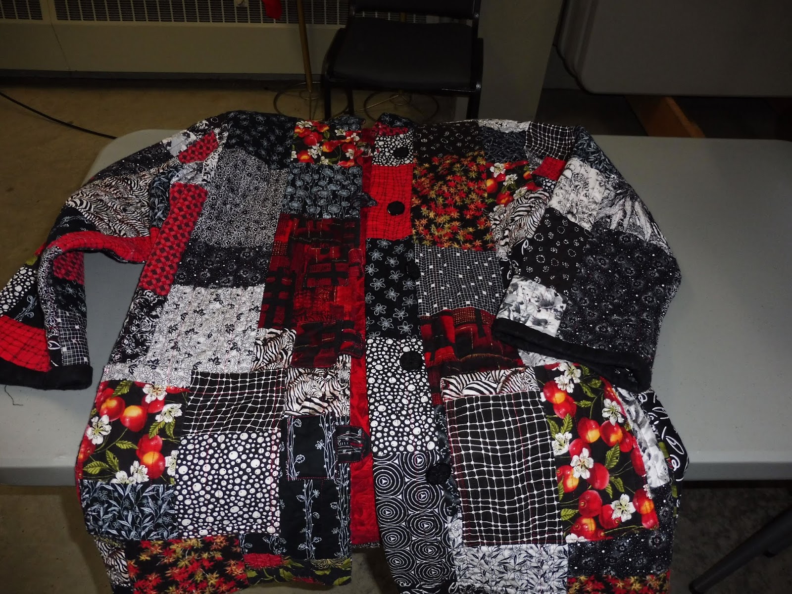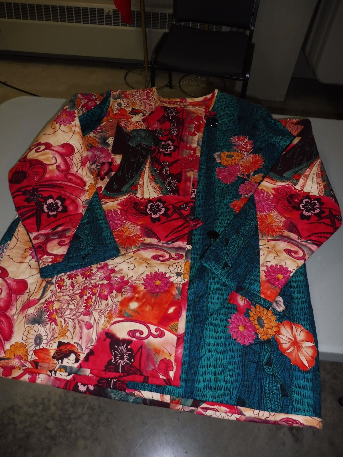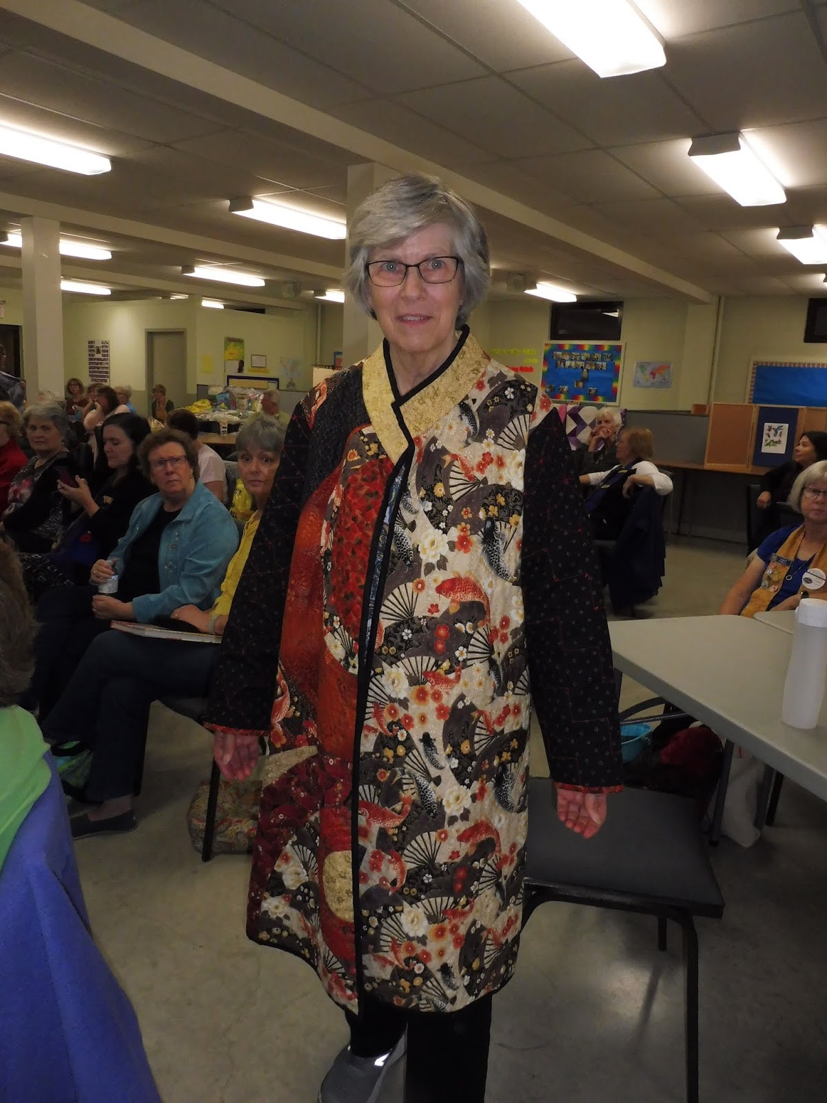 Kim introduced Sandra who has a diverse background, dating back to 1973, starting with sewing, needle craft, embroidery, beading, weaving and quilting. Sandra studied early on with Angelina Di Bello, Montreal, and since then she has made over 135 garments – vests and jackets. She showed 30, as part of her trunk show, and also 15 wallhangings and quilts. Guild members modeled the garments, highlighting various techniques – pleating, beading, handmade button loops, etc. Most garments are quilted tops to the batting, not sandwiched to the lining. Some summer wear had no batting.