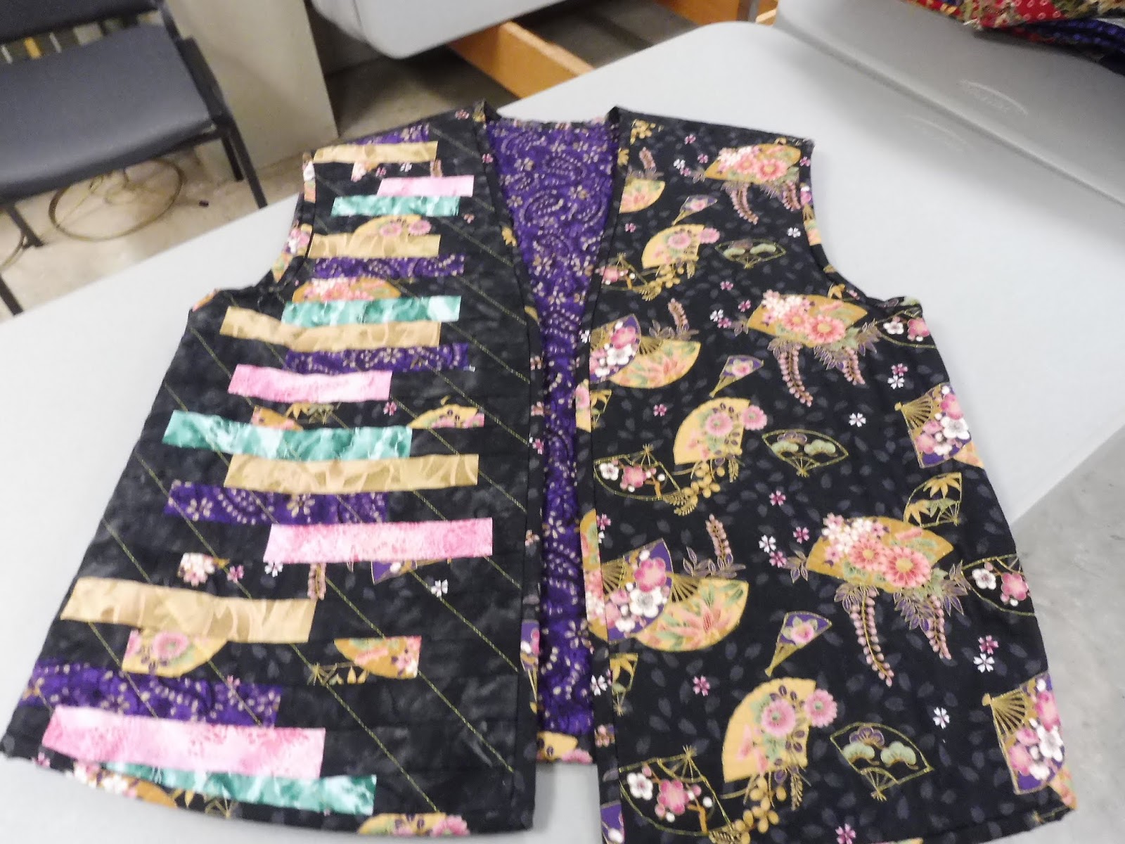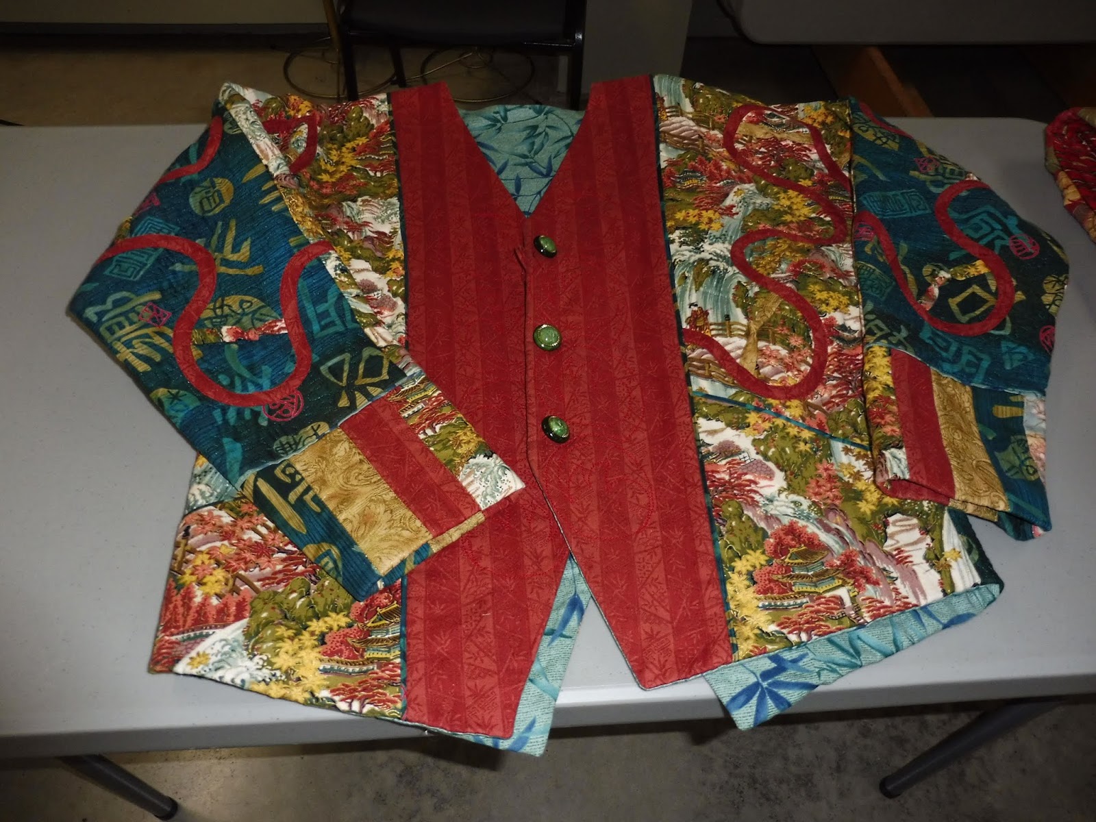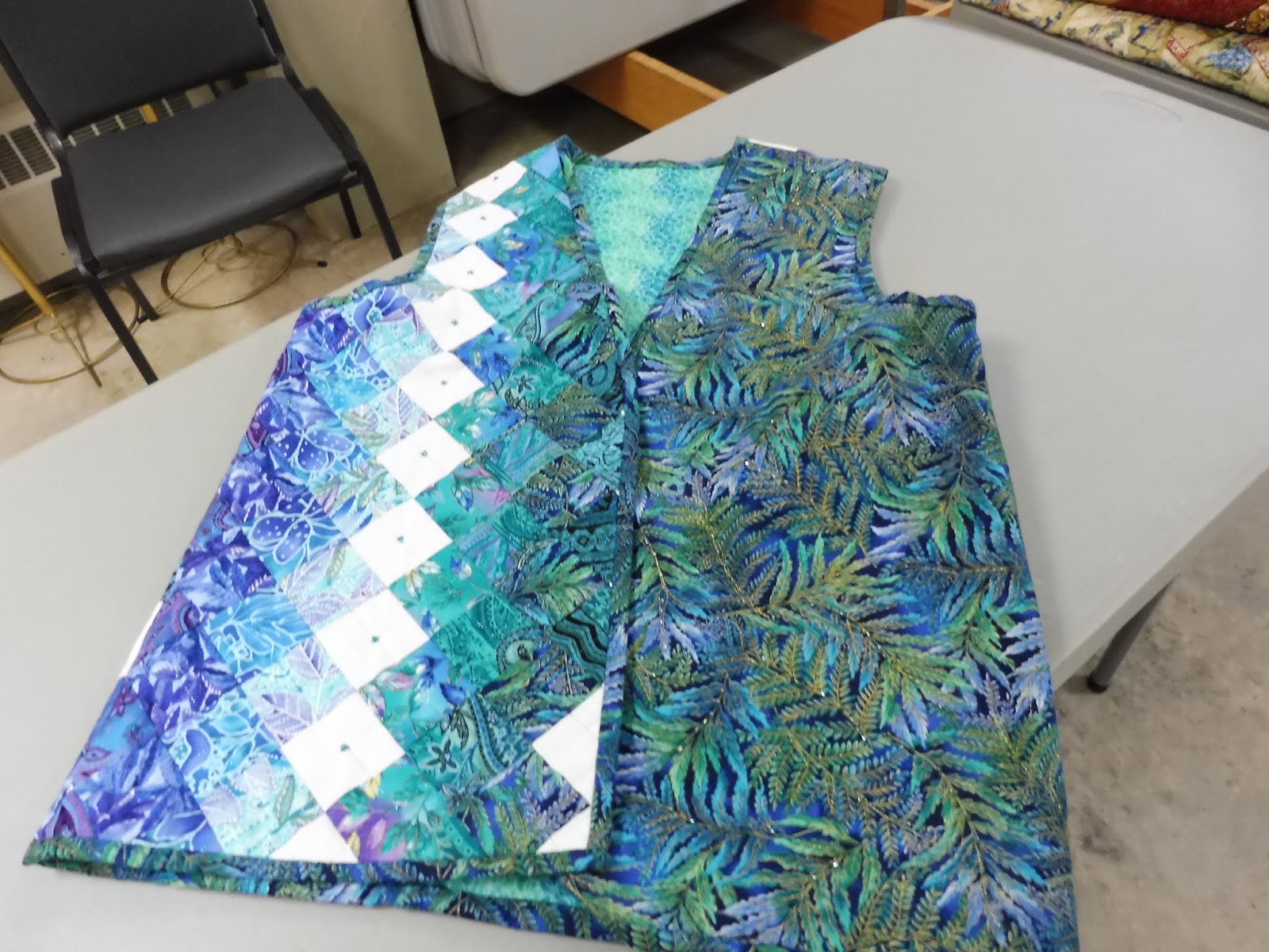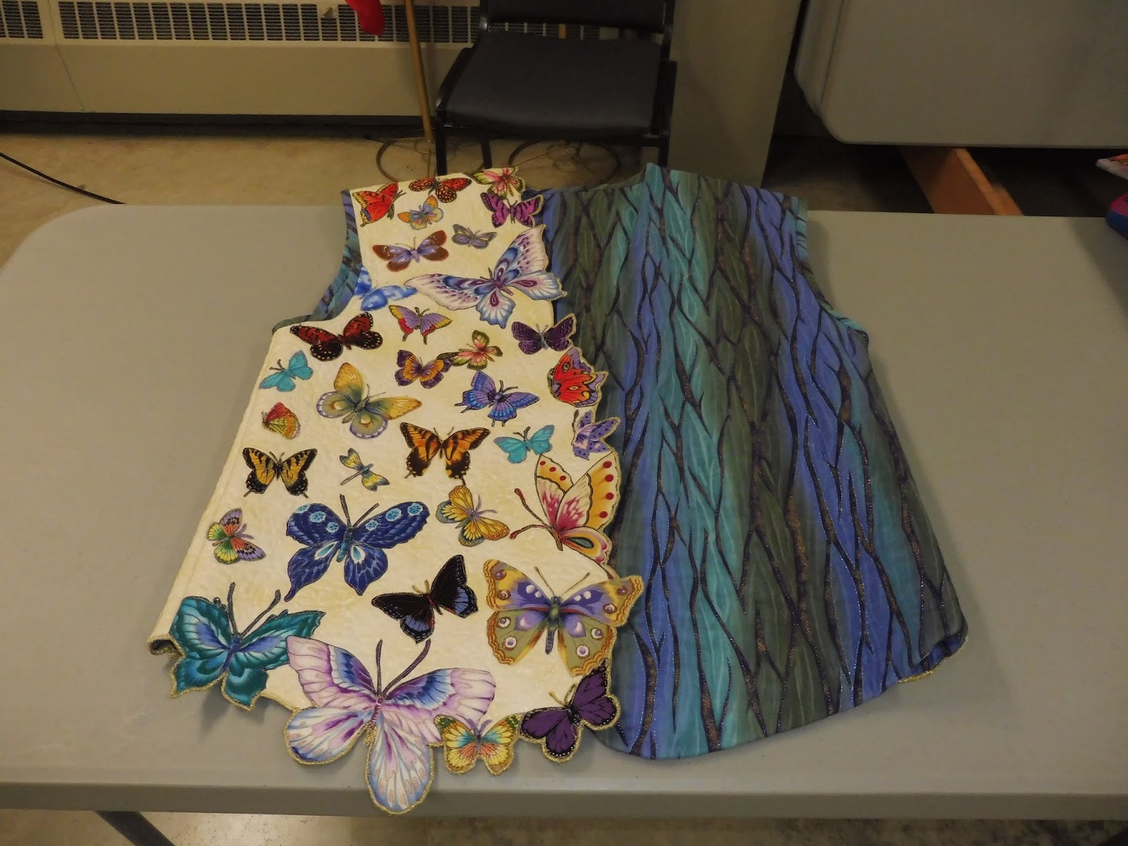 Kim introduced Sandra who has a diverse background, dating back to 1973, starting with sewing, needle craft, embroidery, beading, weaving and quilting. Sandra studied early on with Angelina Di Bello, Montreal, and since then she has made over 135 garments – vests and jackets. She showed 30, as part of her trunk show, and also 15 wallhangings and quilts. Guild members modeled the garments, highlighting various techniques – pleating, beading, handmade button loops, etc. Most garments are quilted tops to the batting, not sandwiched to the lining. Some summer wear had no batting.