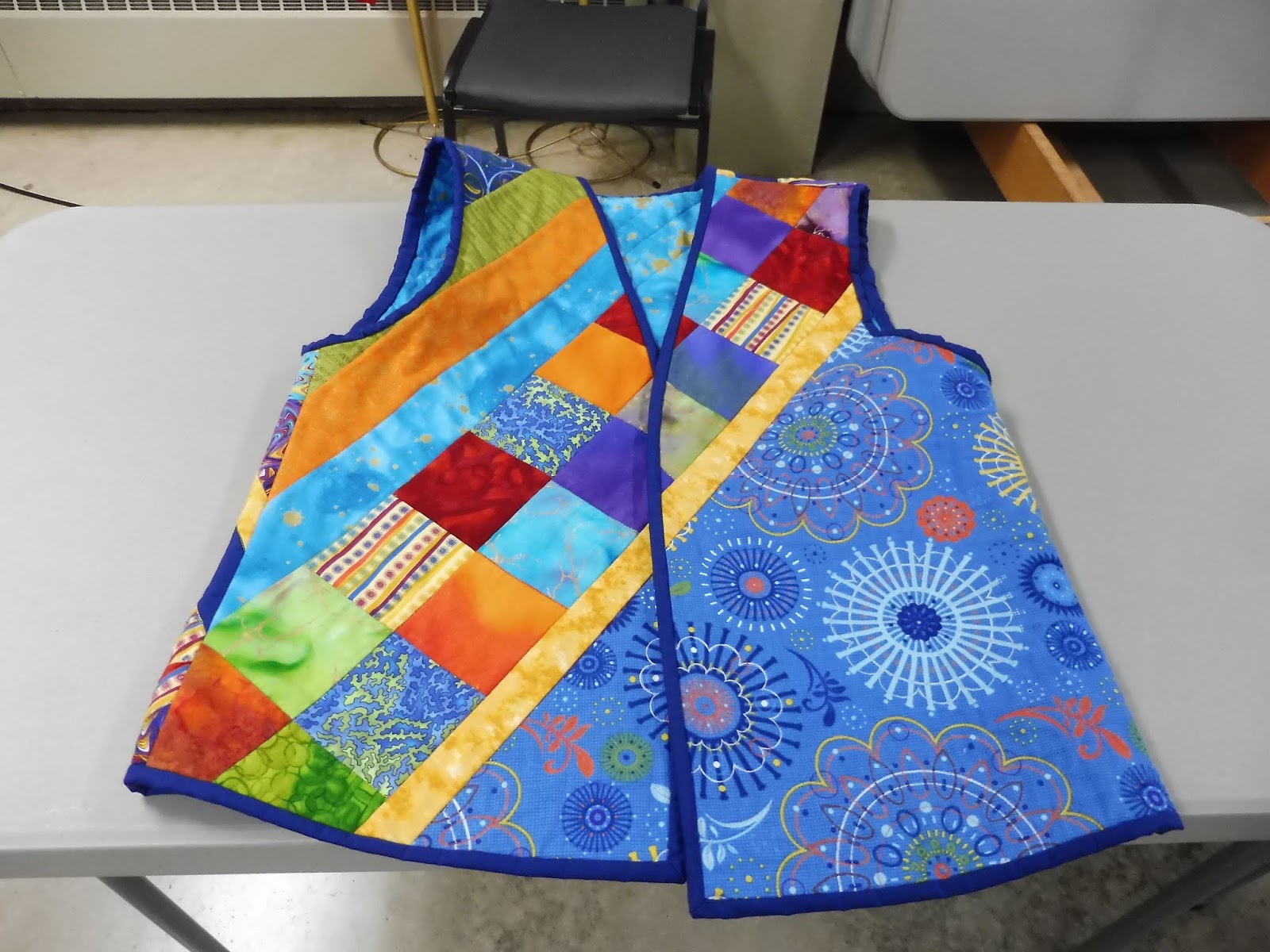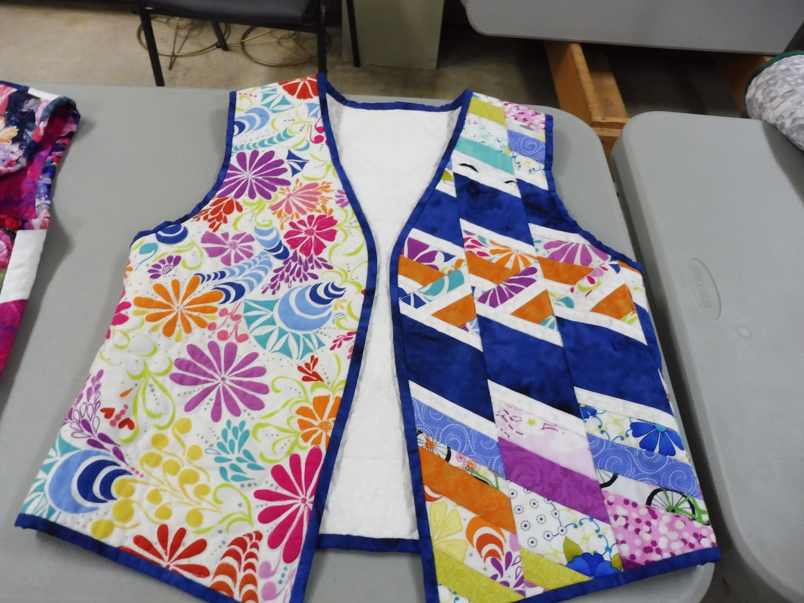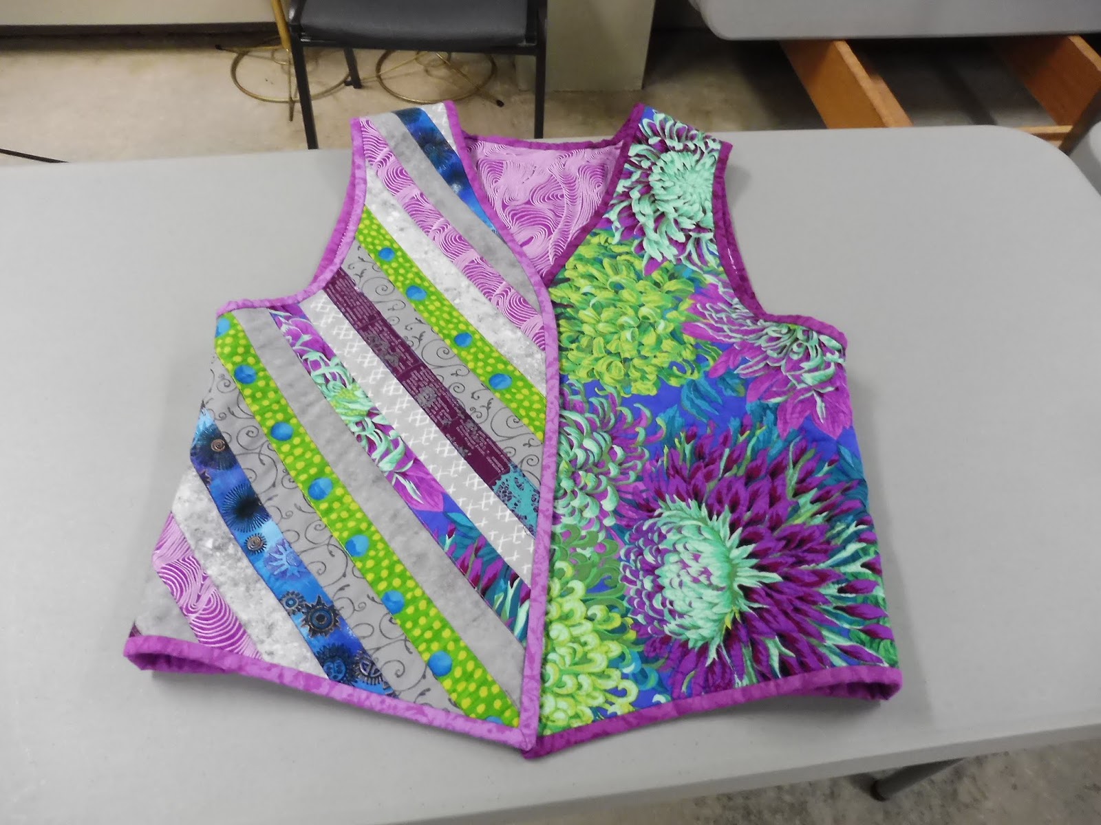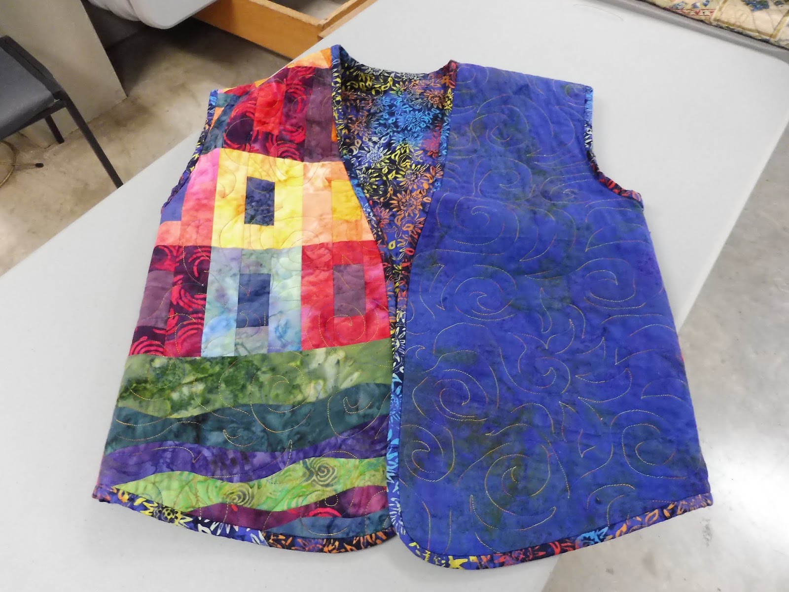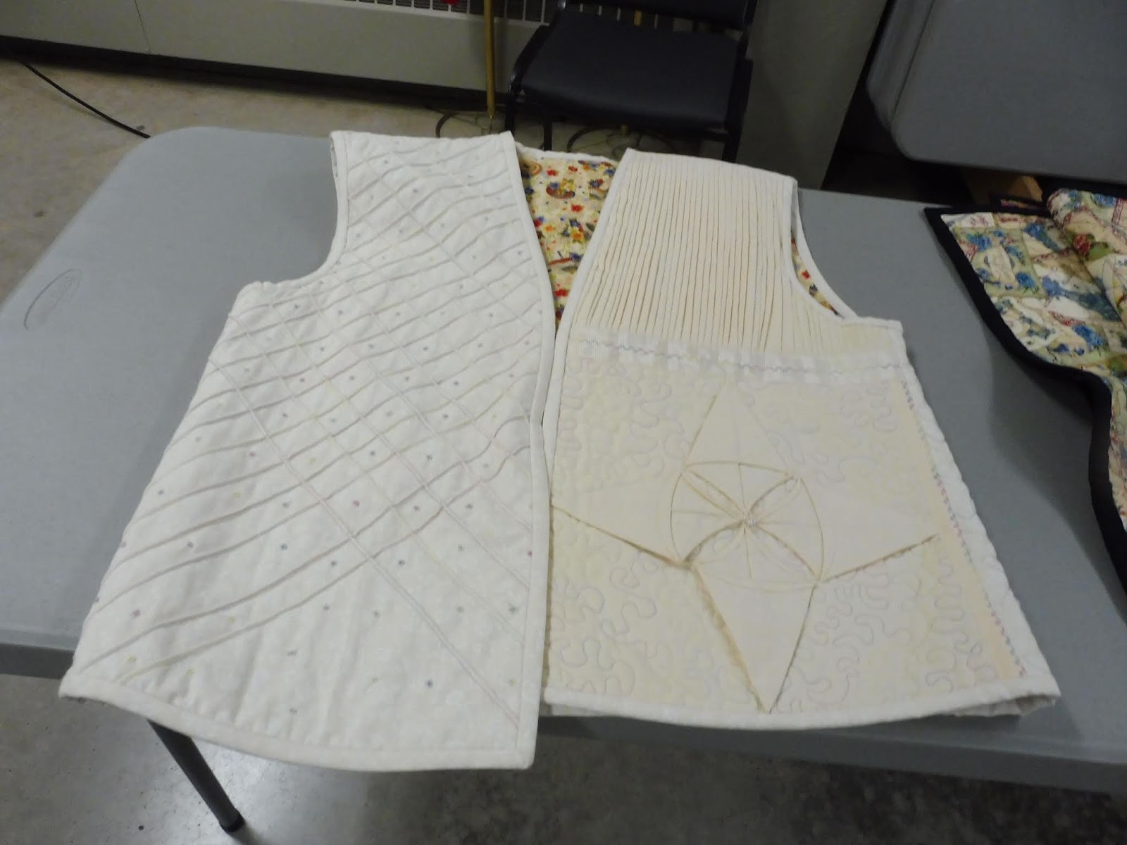 Kim introduced Sandra who has a diverse background, dating back to 1973, starting with sewing, needle craft, embroidery, beading, weaving and quilting. Sandra studied early on with Angelina Di Bello, Montreal, and since then she has made over 135 garments – vests and jackets. She showed 30, as part of her trunk show, and also 15 wallhangings and quilts. Guild members modeled the garments, highlighting various techniques – pleating, beading, handmade button loops, etc. Most garments are quilted tops to the batting, not sandwiched to the lining. Some summer wear had no batting.