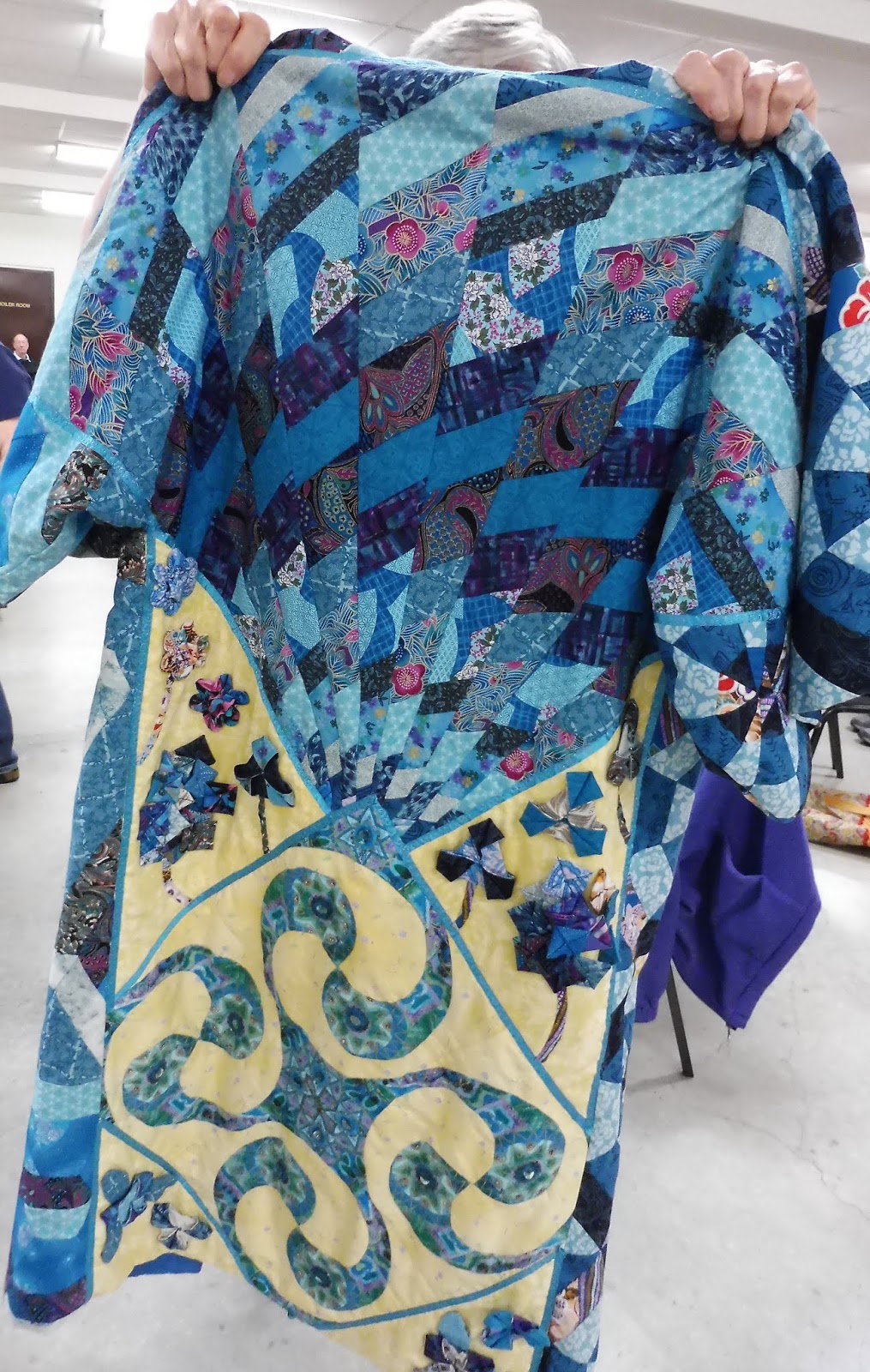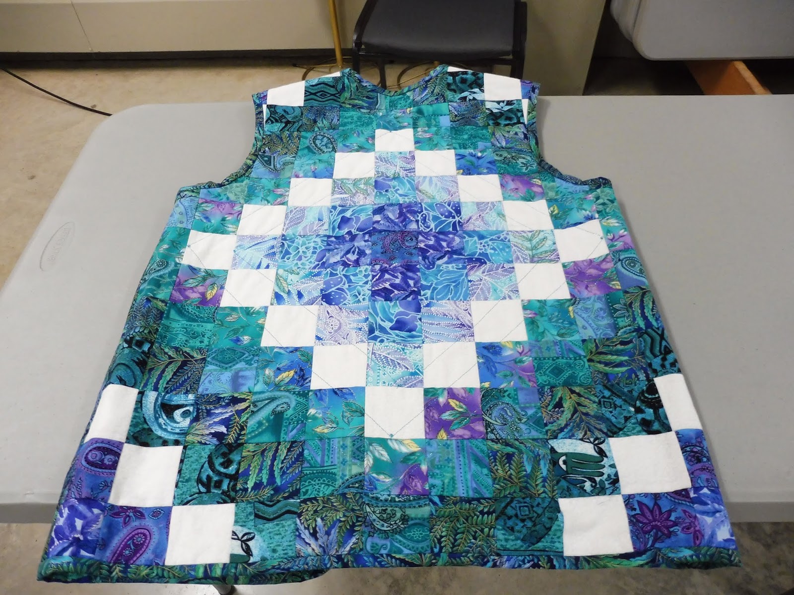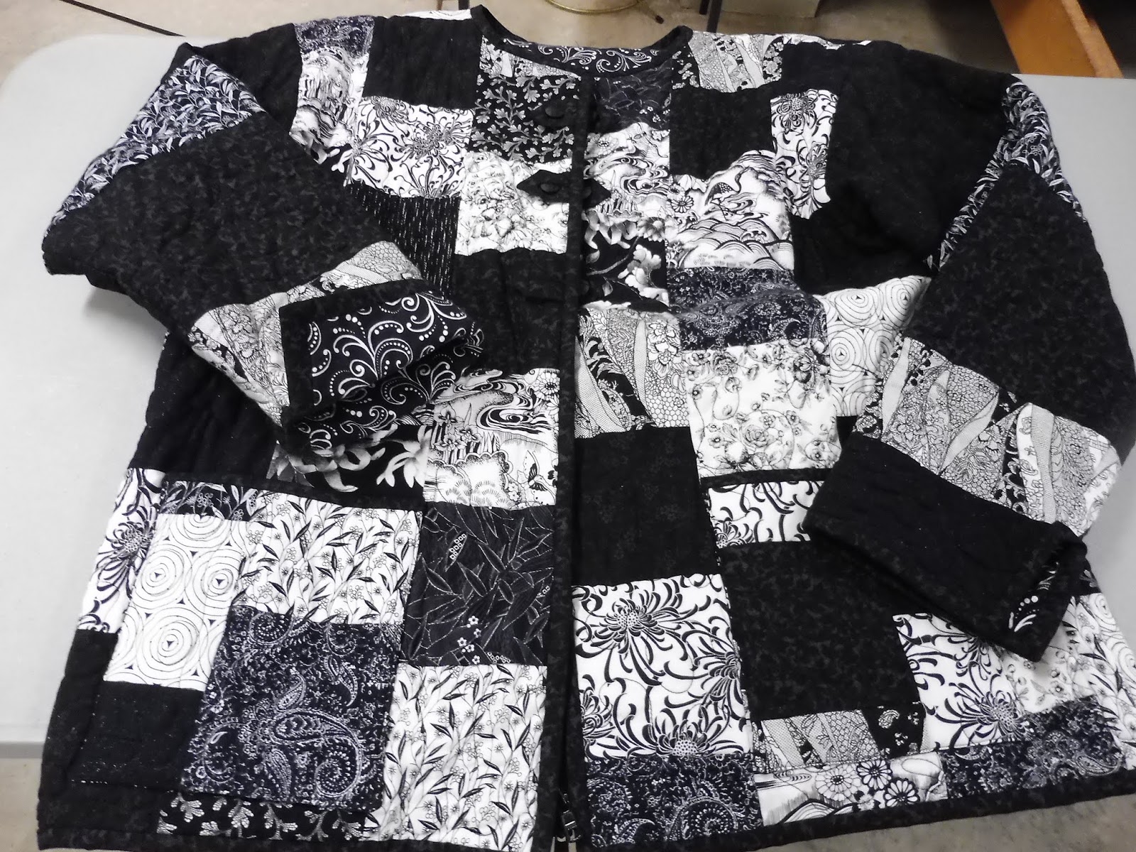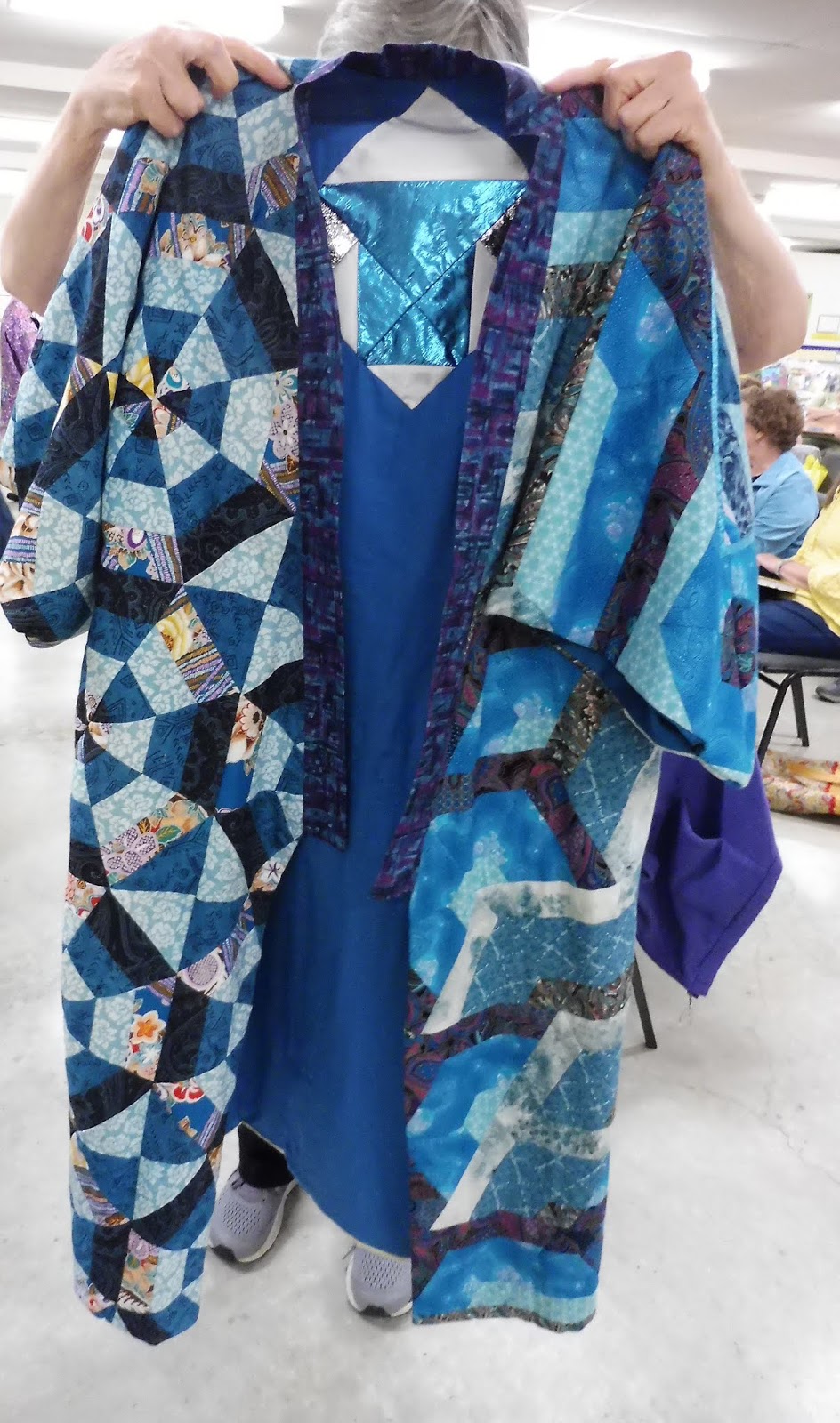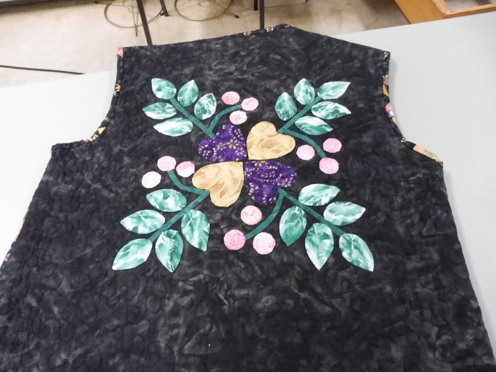 Kim introduced Sandra who has a diverse background, dating back to 1973, starting with sewing, needle craft, embroidery, beading, weaving and quilting. Sandra studied early on with Angelina Di Bello, Montreal, and since then she has made over 135 garments – vests and jackets. She showed 30, as part of her trunk show, and also 15 wallhangings and quilts. Guild members modeled the garments, highlighting various techniques – pleating, beading, handmade button loops, etc. Most garments are quilted tops to the batting, not sandwiched to the lining. Some summer wear had no batting.