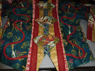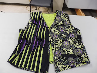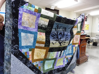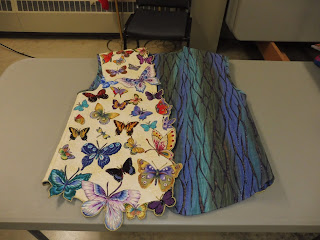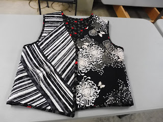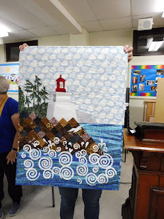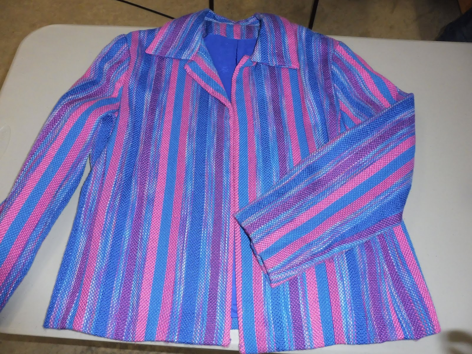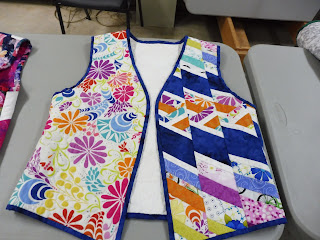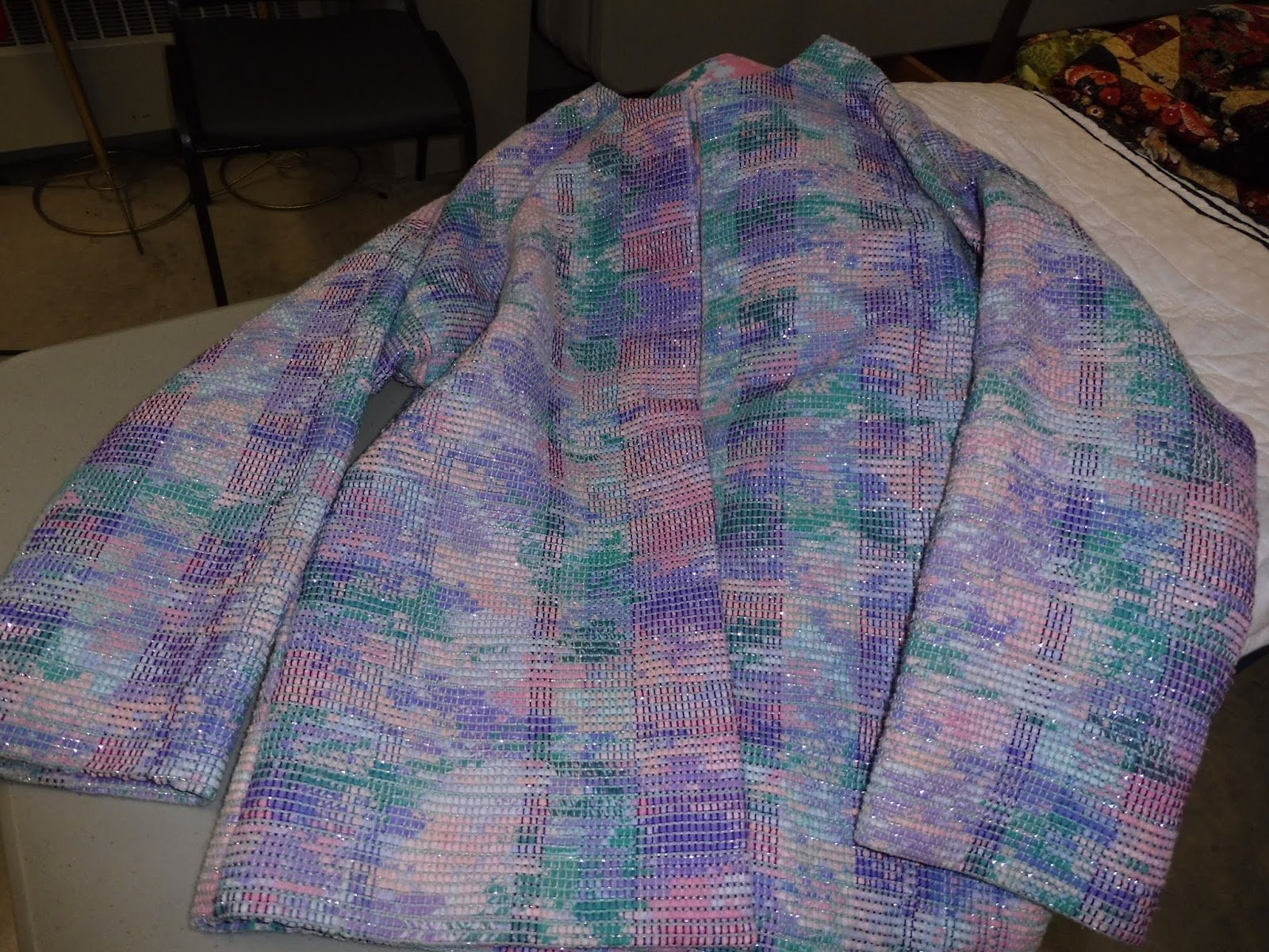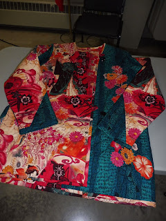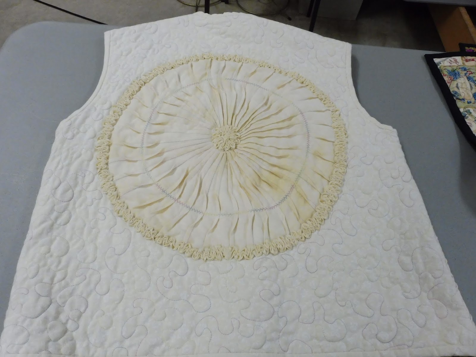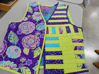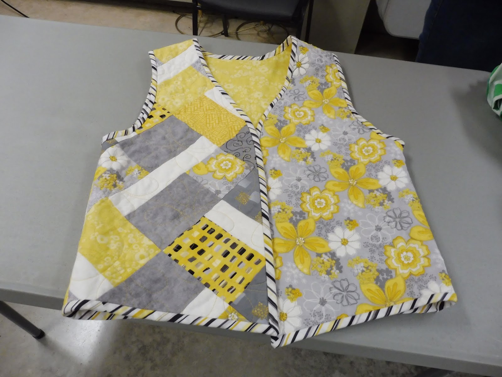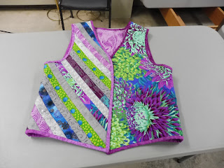Kim introduced Sandra who has a diverse background, dating back to 1973, starting with sewing, needle craft, embroidery, beading, weaving and quilting. Sandra studied early on with Angelina Di Bello, Montreal, and since then she has made over 135 garments – vests and jackets. She showed 30, as part of her trunk show, and also 15 wallhangings and quilts. Guild members modeled the garments, highlighting various techniques – pleating, beading, handmade button loops, etc. Most garments are quilted tops to the batting, not sandwiched to the lining. Some summer wear had no batting.
