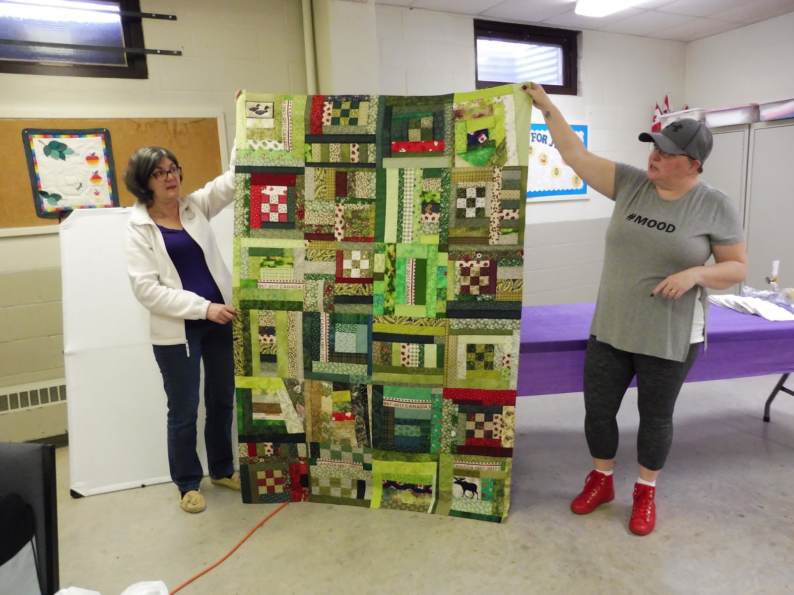 A large group of members from the guild met on Saturday to work together on a large variety of outreach projects. We worked on slab blocks for the Canadian Quilters Association. Our notion of the month for the March meeting was a strip of green fabric. This pile of fabric turned into a lovely slab block quilt.