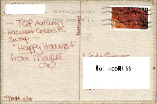 How to finish it up? Simply fuse it to a stiffener like Peltex, TimTex or even the $.49 a meter drapery buckram from Fabric Land, prepare a Post Card-like “back” complete with a line down the center, your return address, a “to” address space, a place for a stamp and the word “POSTCARD” clearly marked on it.