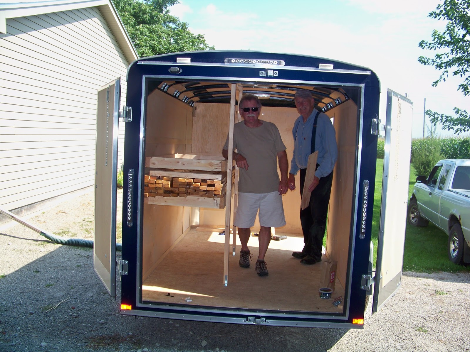 Micki says that ” Ray Campbell (Tiny’s husband ) came with his friend Frank, and together they worked on putting shelves into our new trailer. I then, did an inventory of everything we had and put in into the trailer in some kind of order. Looks good, eh! Last week Lorna and I went to Edith’s and picked up the remaining quilt show stuff and it too is now in the trailer. Everything in one spot!“