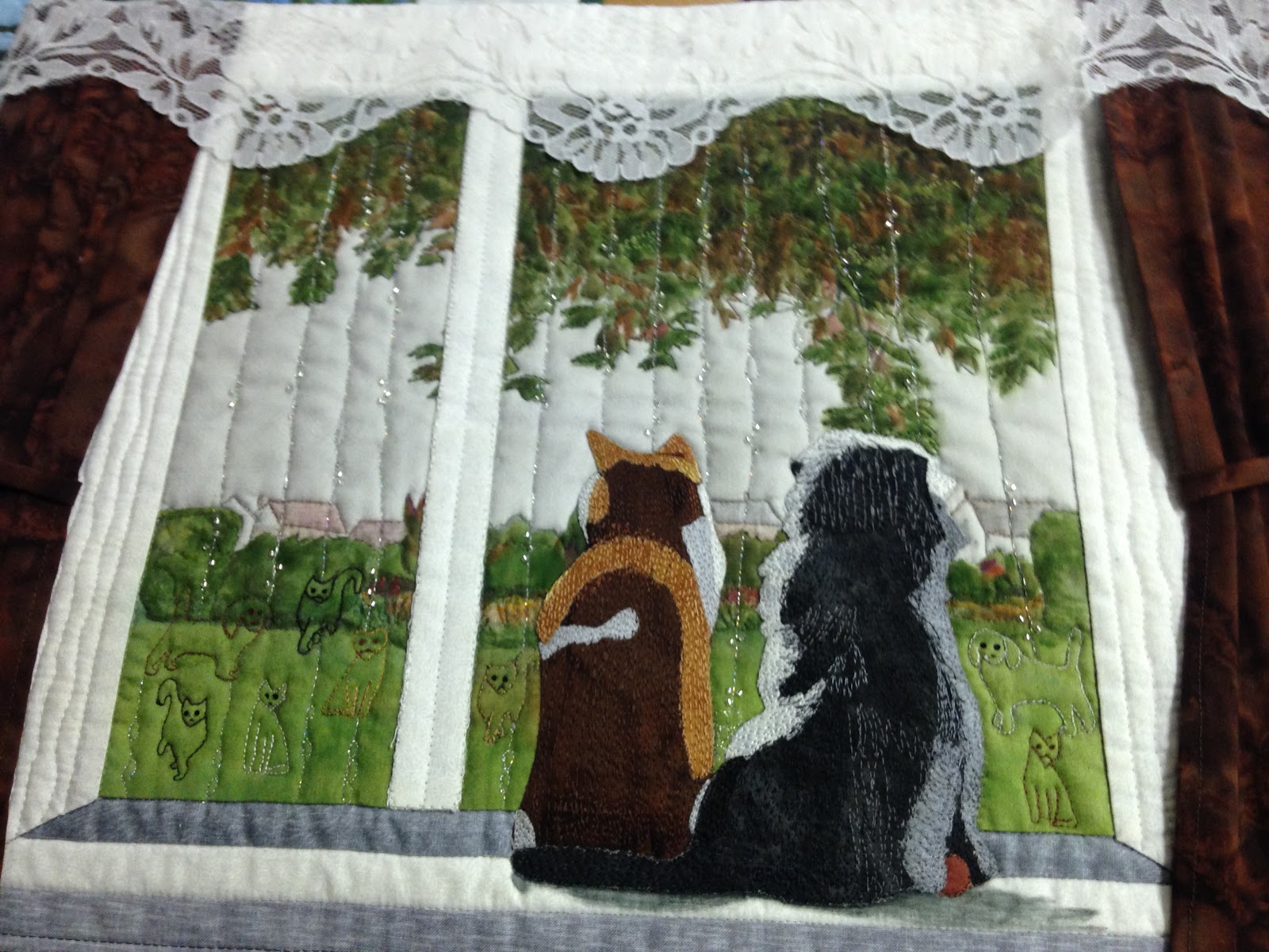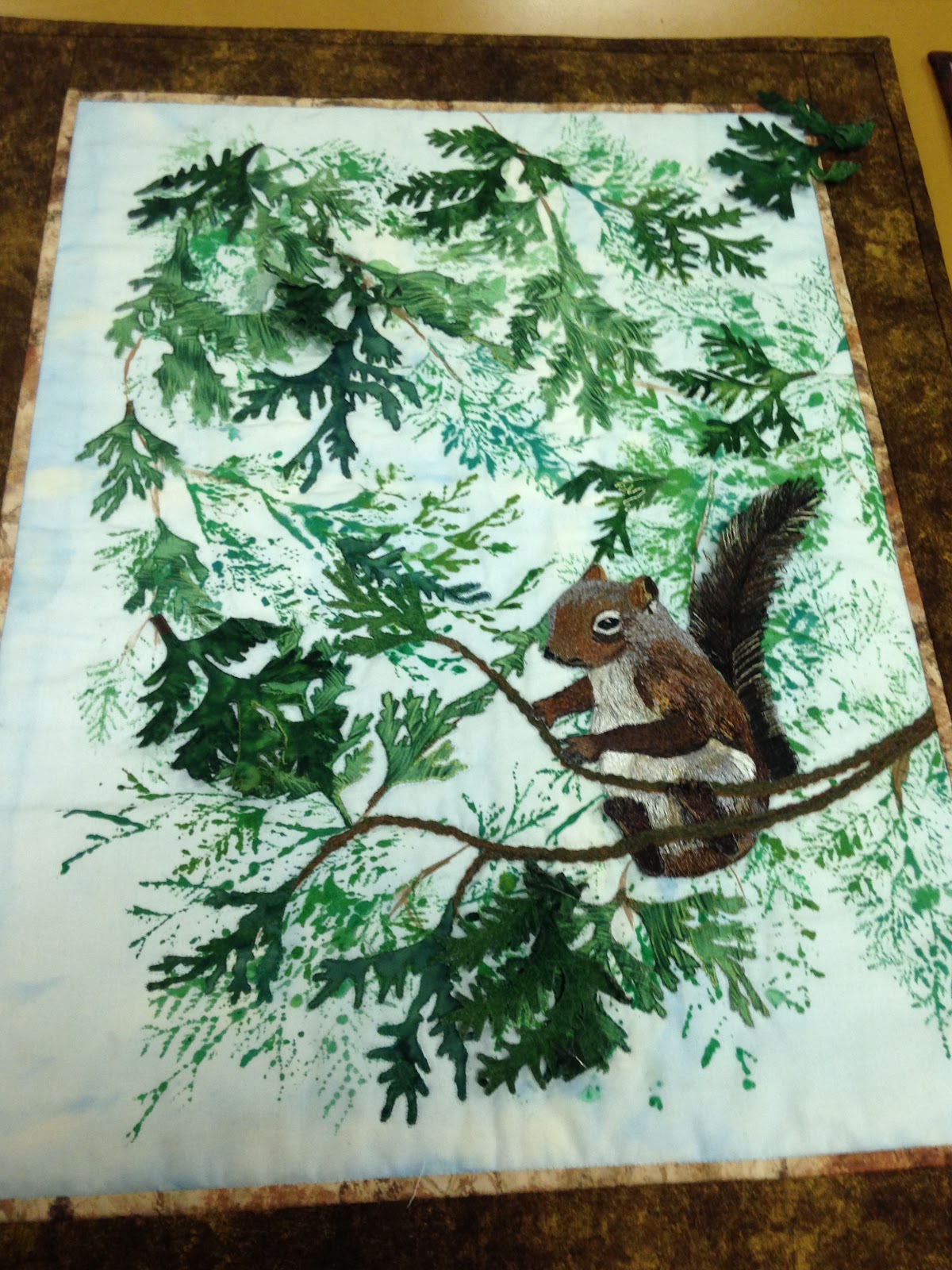 Kathy has a BSc in Biology and a natural interest in sunsets, landscapes. She started quilting/applique in 1989 and from there 5 years in oil , watercolour and hand drawing. She’s had submissions in the Grand National. Thread works is her specialty although she also makes wearable art and accessorizes them with polymer clay buttons she makes herself. She recommends Gloria Lowman, Australia, for techniques. Kathy had a presentation reflecting many of her quilts and wall hanging. Following are just a few: