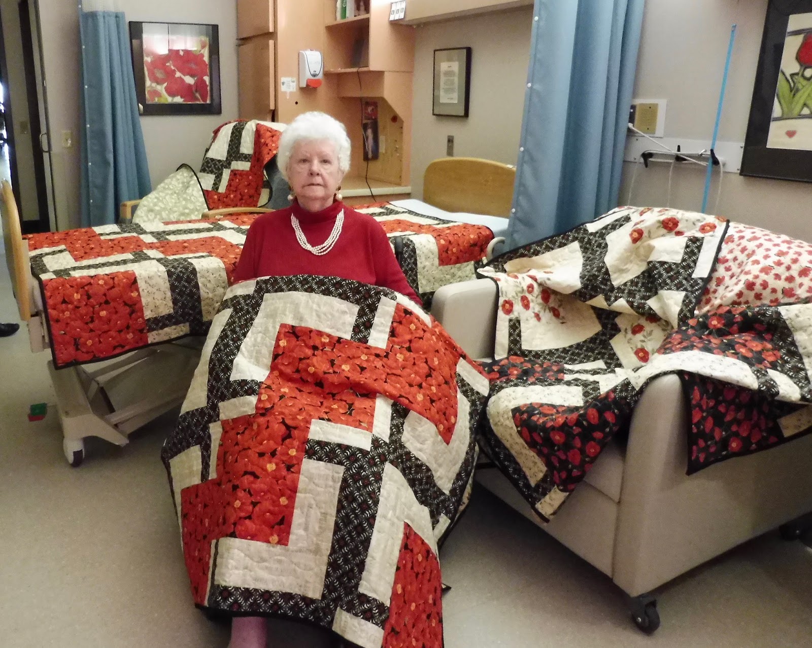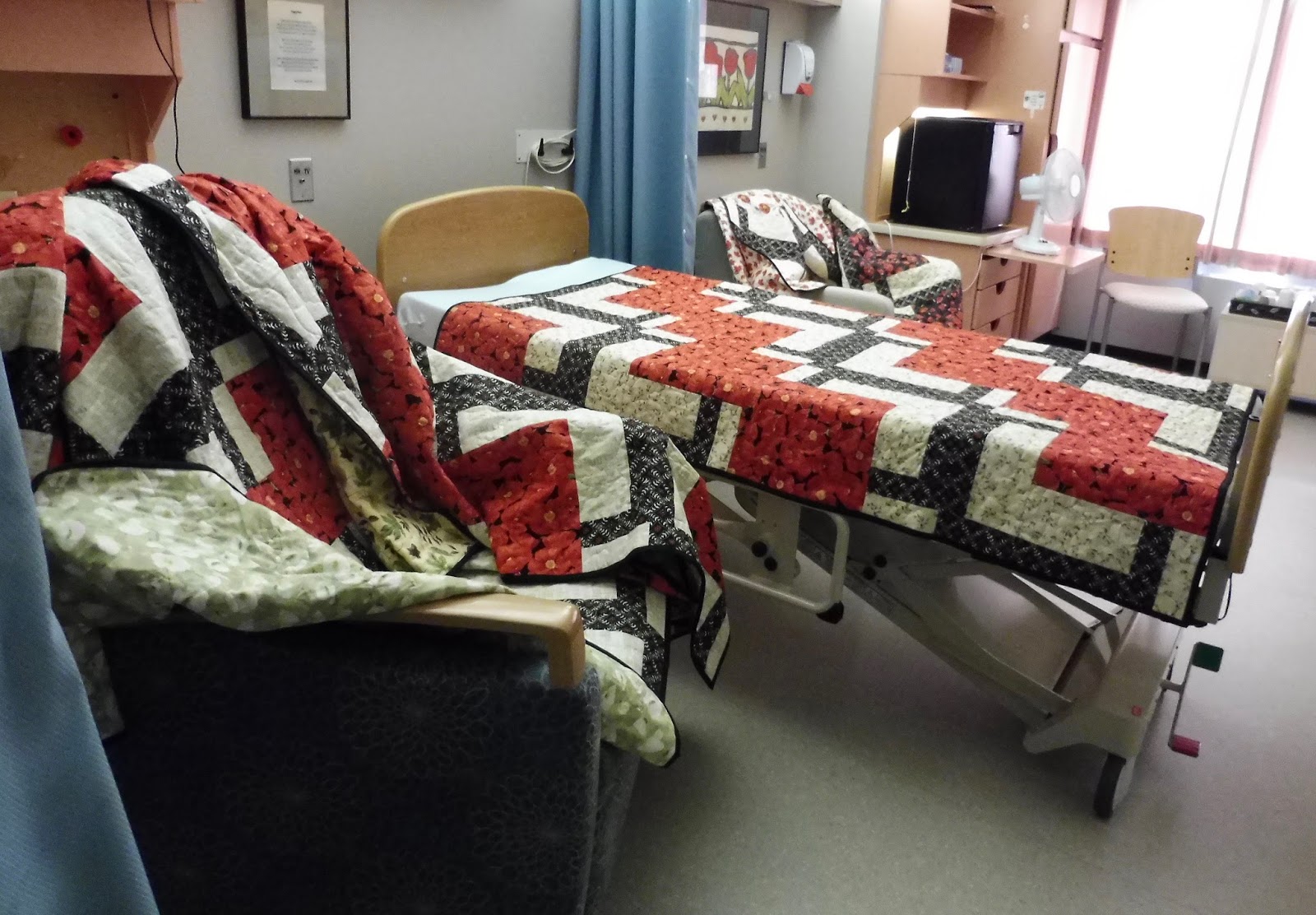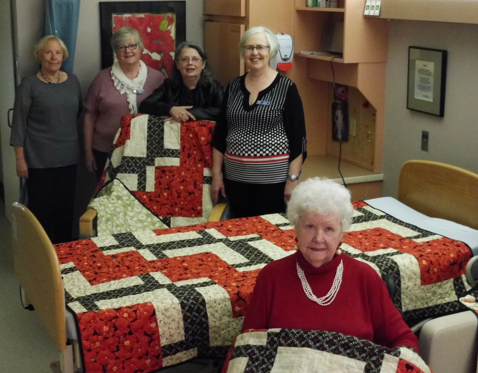 On June 27th, 2017, Lorna M, Bonnie H, and Cathy S attended a meeting of the Resident’s Council at Parkwood Hospital, Western Counties Wing where the veterans live. We presented the council with the poppy quilts that the guild made for the palliative care rooms. They were very gratefully received. We were able to get some pictures of the quilts in place in one of the rooms,